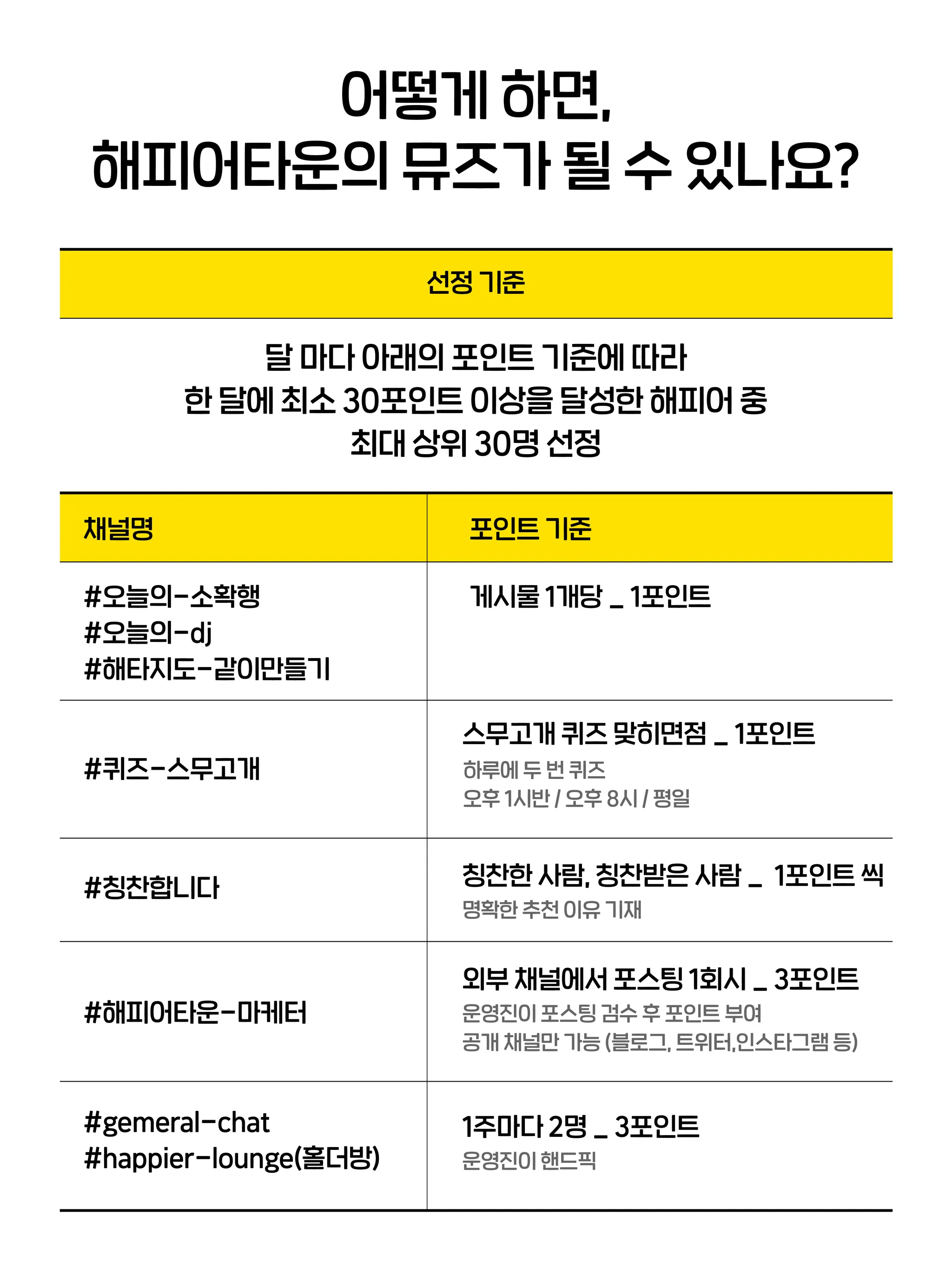 디스코드 내외에서 해피어타운에 좋은 영향을 주는 활동을 하신 분들 대상으로 뮤즈 포인트가 지급되기 때문에 내가 지속해서 열심히 활동하는 만큼 연속으로 뮤즈에 선정되실 수 있습니다.