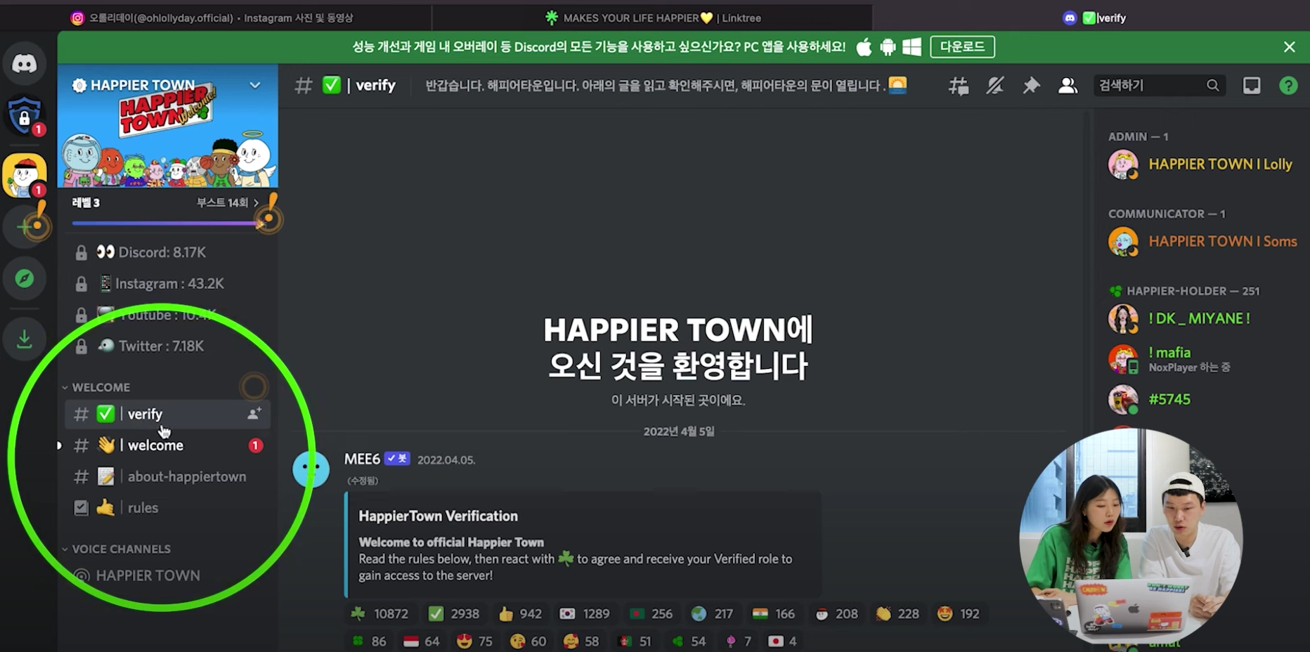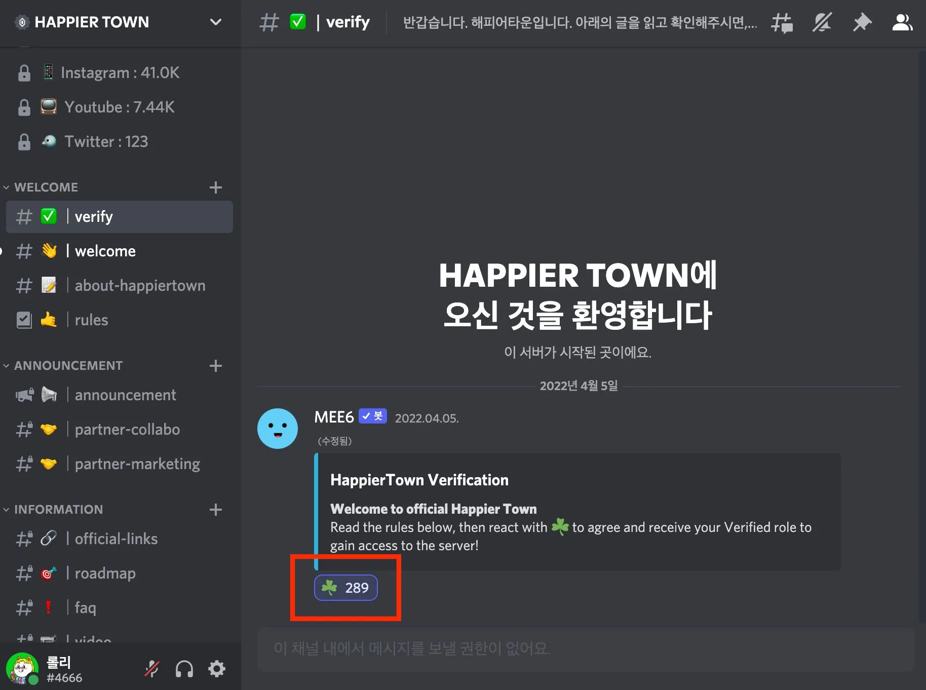 해피어타운 디스코드를 처음 들어가면 verify / welcome / about-happiertown / rules 페이지가 가장 먼저 보여요! 나머지 채널들은 들어와서 인증을 해야지 볼 수 있는 비공개 채널들이랍니다.